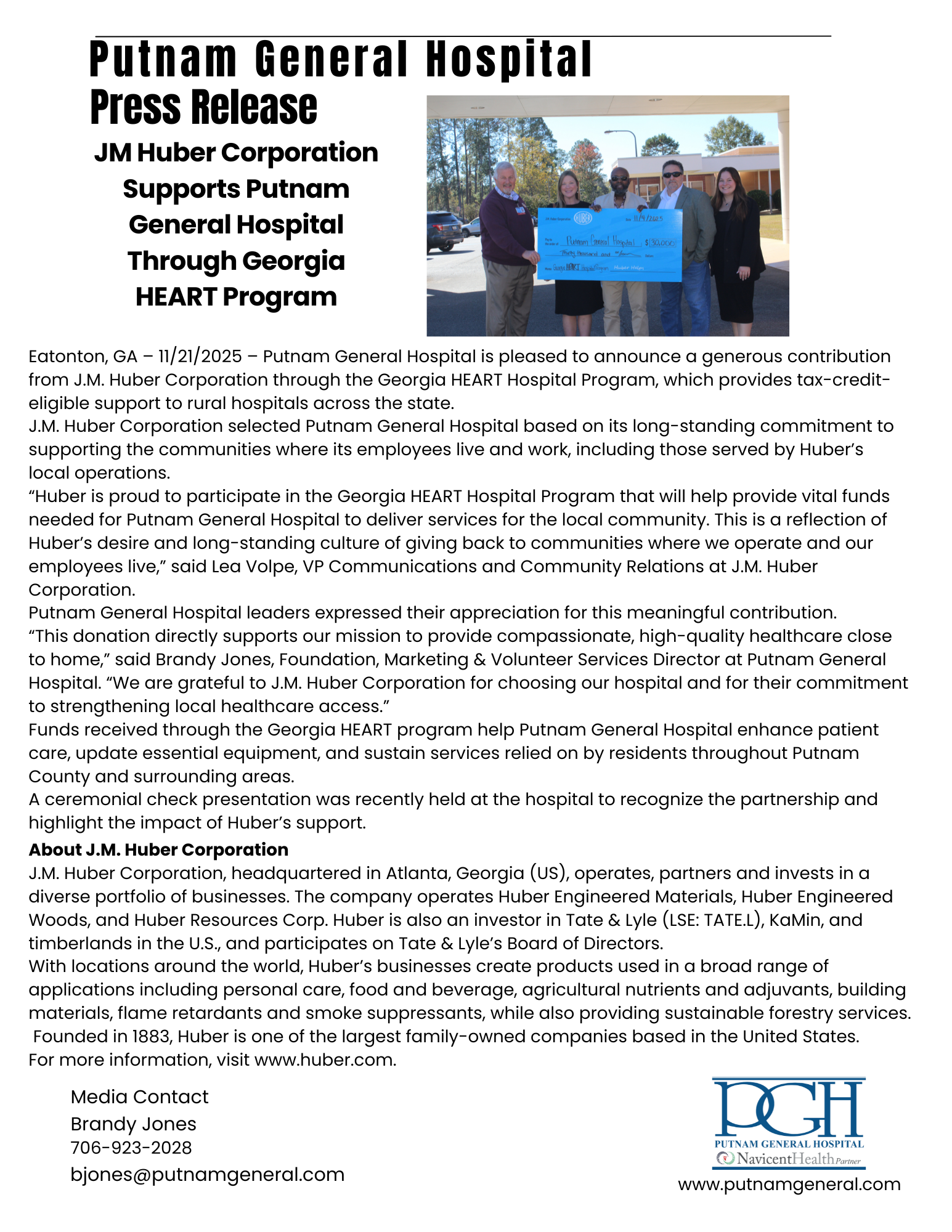 Here at Putnam General Hospital, located in Eatonton, Georgia we understand that healthcare is evolving. We are committed to providing local access to high quality care by continuing to invest in the latest diagnostic and treatment technology. Please explore our website and learn how Putnam General Hospital can help improve your health. We have a passion for caring!