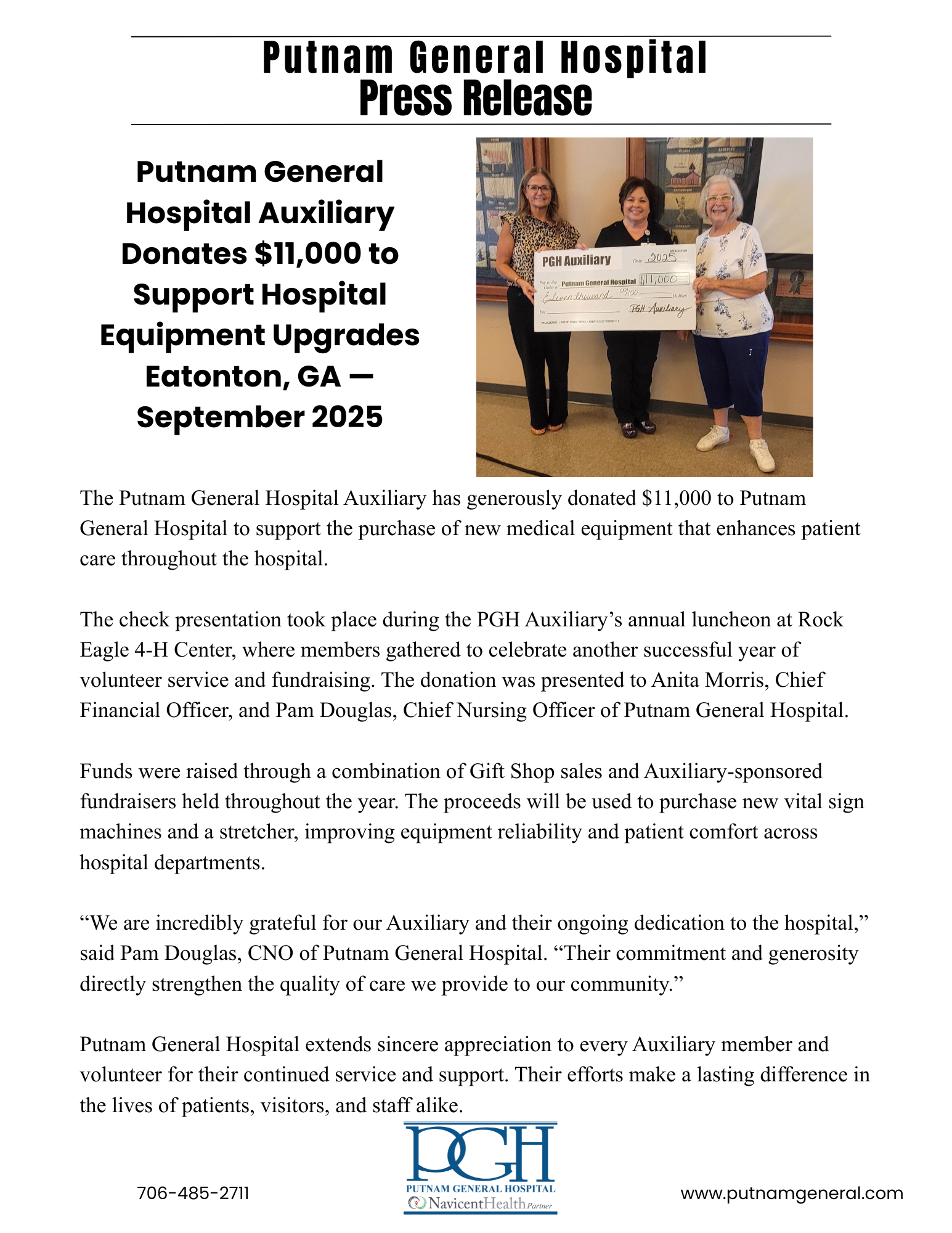 Here at Putnam General Hospital, located in Eatonton, Georgia we understand that healthcare is evolving. We are committed to providing local access to high quality care by continuing to invest in the latest diagnostic and treatment technology. Please explore our website and learn how Putnam General Hospital can help improve your health. We have a passion for caring!